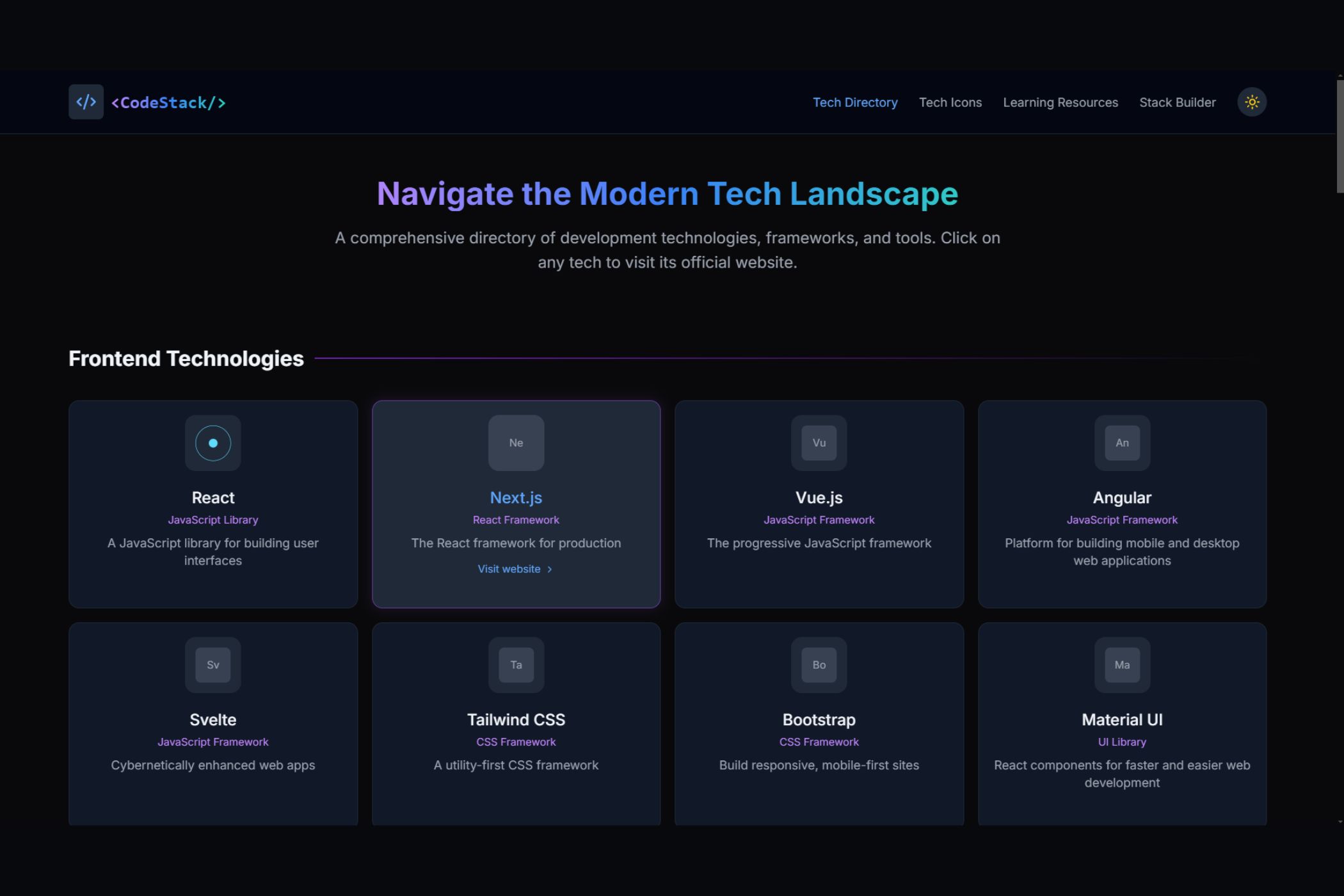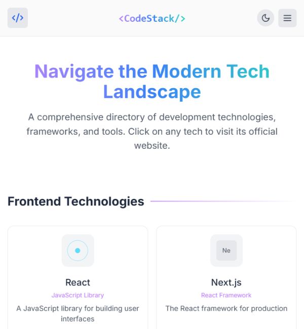 Code Stack is an open-source platform designed to help developers explore and organize programming technologies efficiently. It provides a structured directory of frameworks, libraries, tools, and learning resources, making it easier to navigate the ever-expanding tech landscape.
