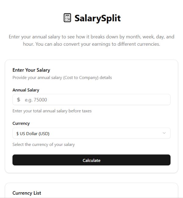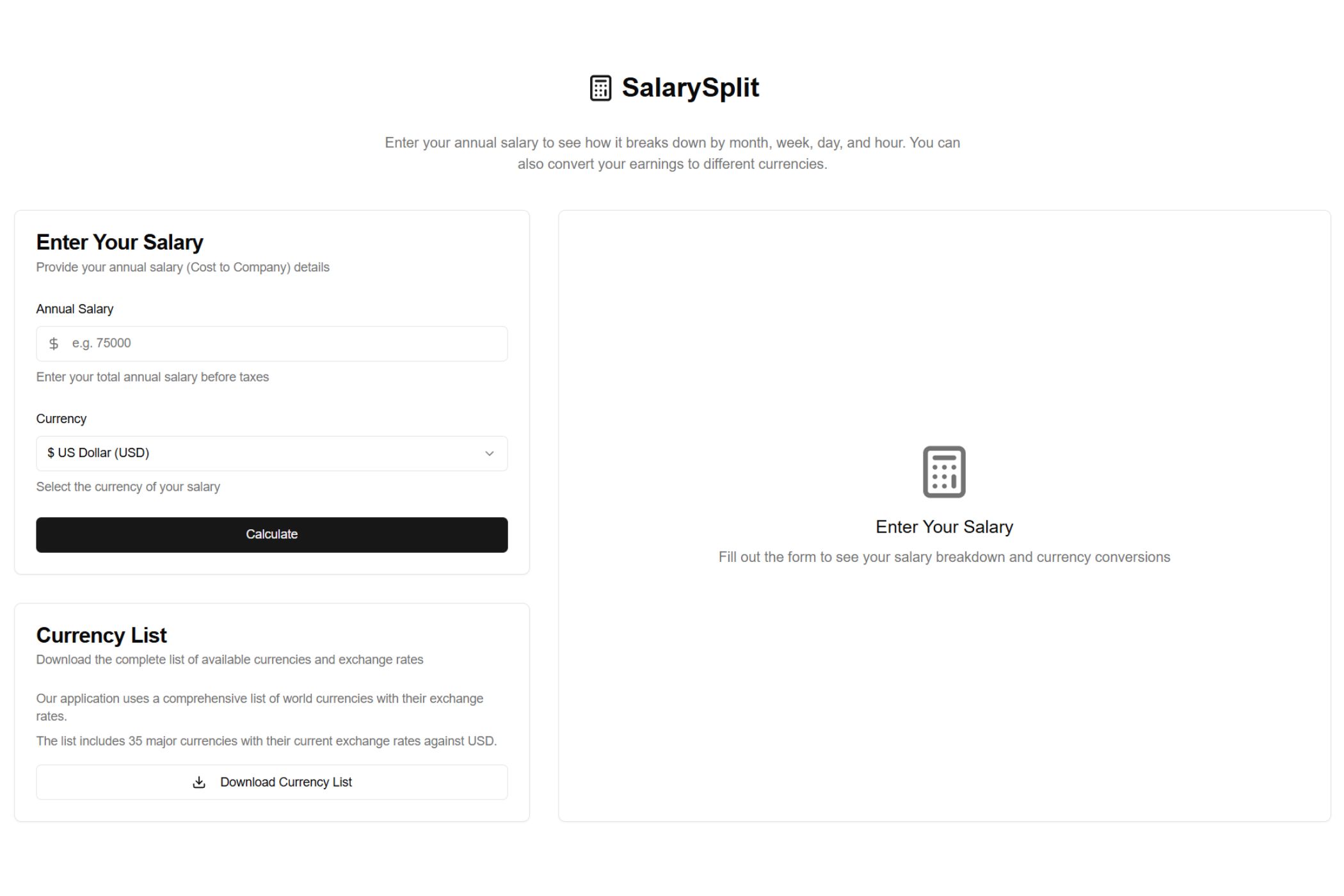 SalarySplit is a responsive React application that allows users to enter their annual salary, break it down into monthly, weekly, daily, and hourly earnings, and convert it into different currencies, with an option to download exchange rate lists.