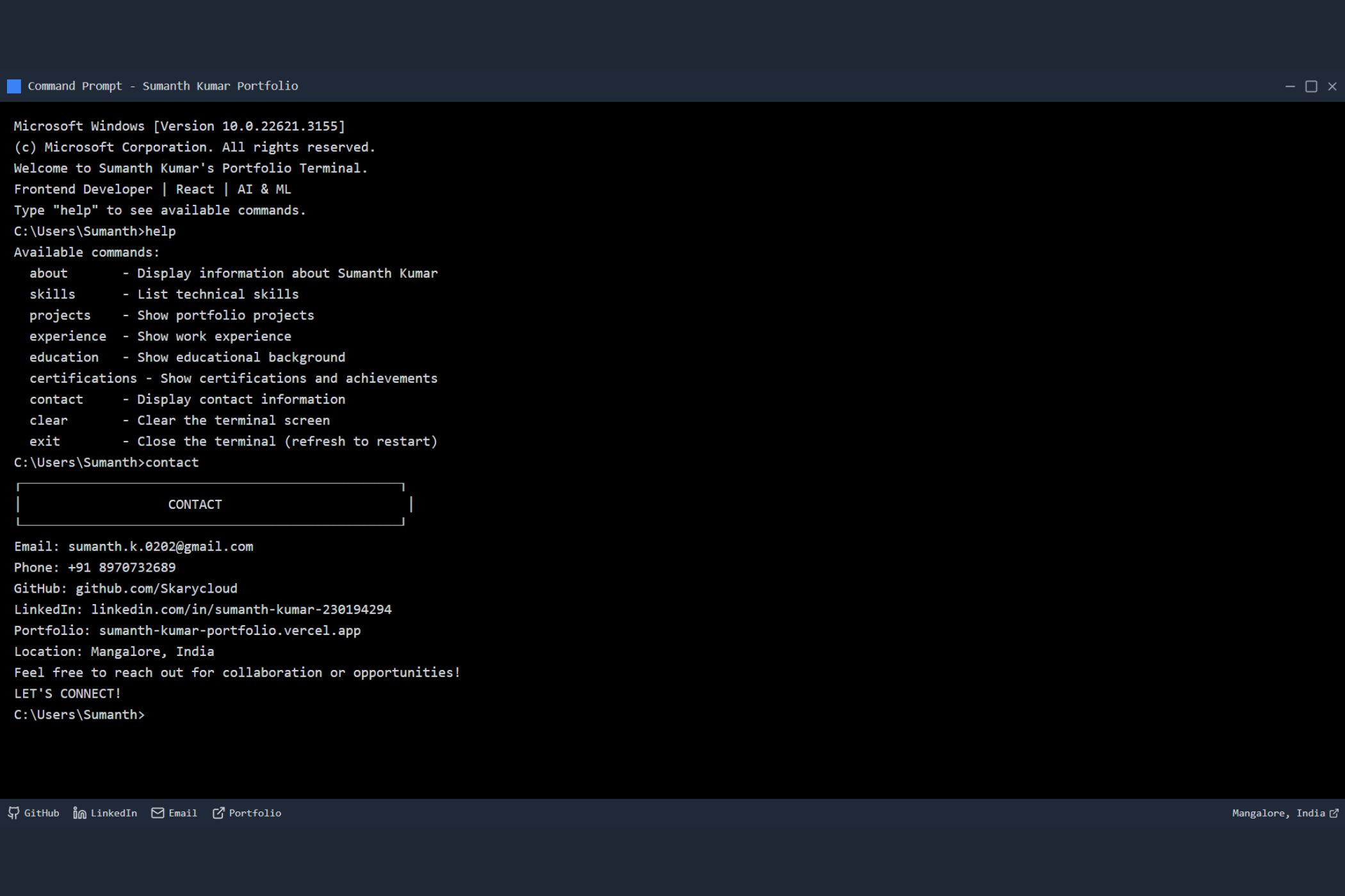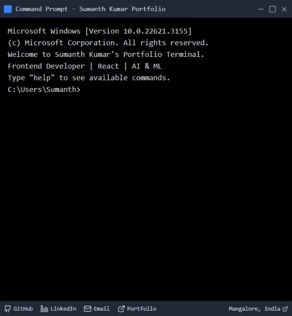 I built my portfolio to look and feel like a Windows Terminal, giving it a unique and interactive experience. Instead of a traditional website, visitors can navigate through my projects, skills, and contact details using command-line-style inputs.