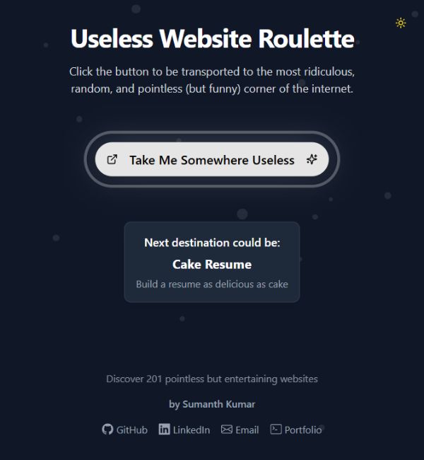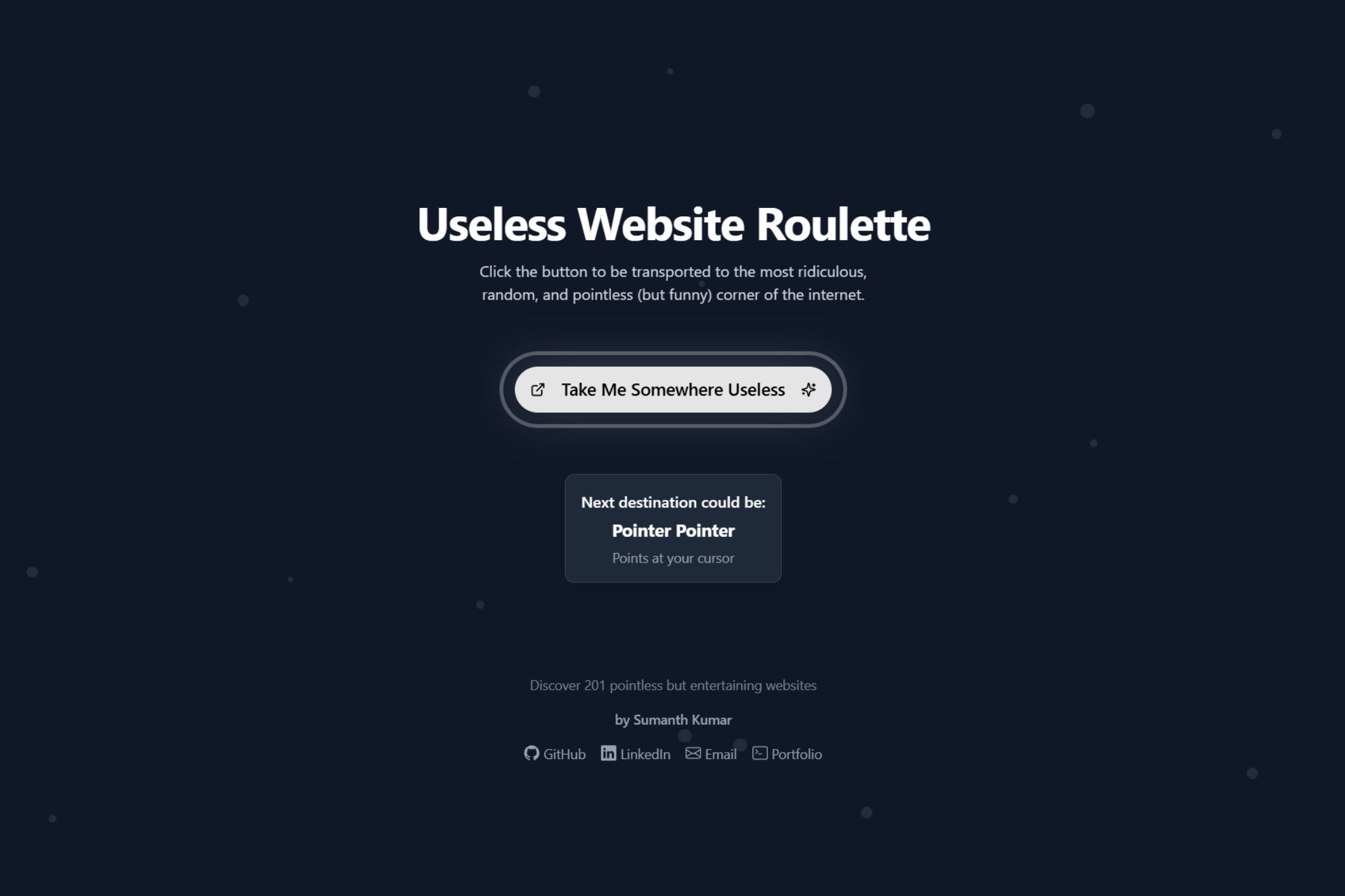 Useless Website Roulette is a Next.js project that transports users to random, ridiculous, and entertaining websites at the click of a button, making internet browsing fun and unpredictable.